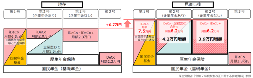 ●国民年金第1号被保険者の拠出限度額(iDeCoと国民年金基金で共通)を月額7.5万円に引き上げる